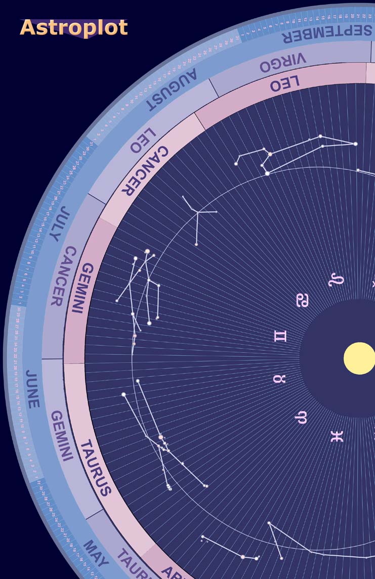 On the calendar chart below, the tropical (western) astrology star-sign dates are indicated on the rim, on a purple base, next to the months. The star positions of the Zodiac constellations are illustrated on the chart's centre. The Zodiac constellation positions are plotted using precise astronomy data. On the pink base, the names of the Zodiac constellations are aligned with the actual position of the constellations. Notice the astrology calendar star-sign dates, in purple, are as much as a month out of alignment with where the actual constellations are located, indicated on the pink rim.
